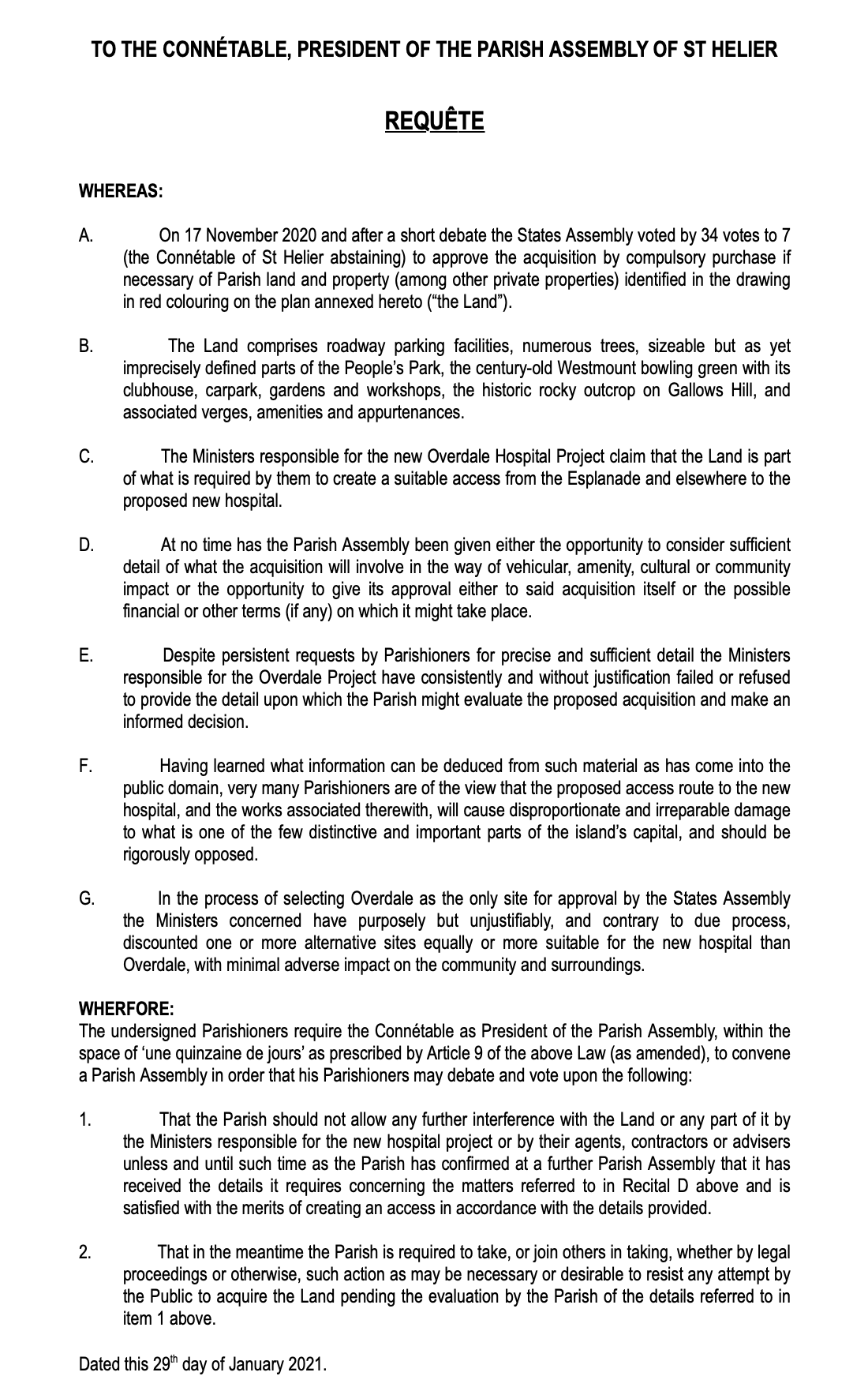 On Friday morning, he announced that a requête – an centuries-old way of forcing a Parish Assembly – was being signed and would soon be served on the Constable of St. Helier to ensure any purchases of Parish land cannot go through until more information about the proposed access route to the new hospital is received.